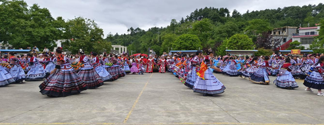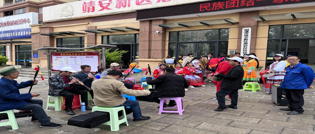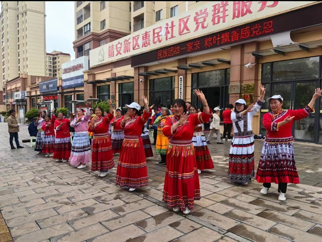 當(dāng)?shù)厣贁?shù)民族民間藝術(shù)團(tuán)伴著經(jīng)典紅歌的旋律,在靖安安置區(qū)惠民社區(qū)新時(shí)代文明實(shí)踐站為鄰里鄉(xiāng)親帶來(lái)特色民族演出。