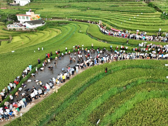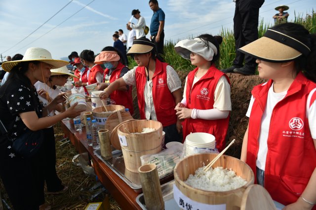 打谷、捉魚、抓鴨、打糍粑、稻田拔河、吃玉米、吃西瓜等農(nóng)事體驗(yàn)和趣味比賽在大家的吶喊助威、歡聲笑語(yǔ)聲中緊張有序地進(jìn)行著,其中穿插有關(guān)“三農(nóng)”知識(shí)的有獎(jiǎng)競(jìng)答?;顒?dòng)現(xiàn)場(chǎng),大家津津有味地品嘗了桂圓、花生、毛豆等勞動(dòng)果實(shí)。在品鑒新品大米、農(nóng)耕文化展示、鄉(xiāng)村涂鴉、鄉(xiāng)村閱讀季活動(dòng)中,來(lái)自十里八鄉(xiāng)的村民和游客盡情體驗(yàn)、樂(lè)在其中。各項(xiàng)比賽結(jié)束后,獲獎(jiǎng)人員欣喜地領(lǐng)取獎(jiǎng)品——稻田鴨和金谷大米。